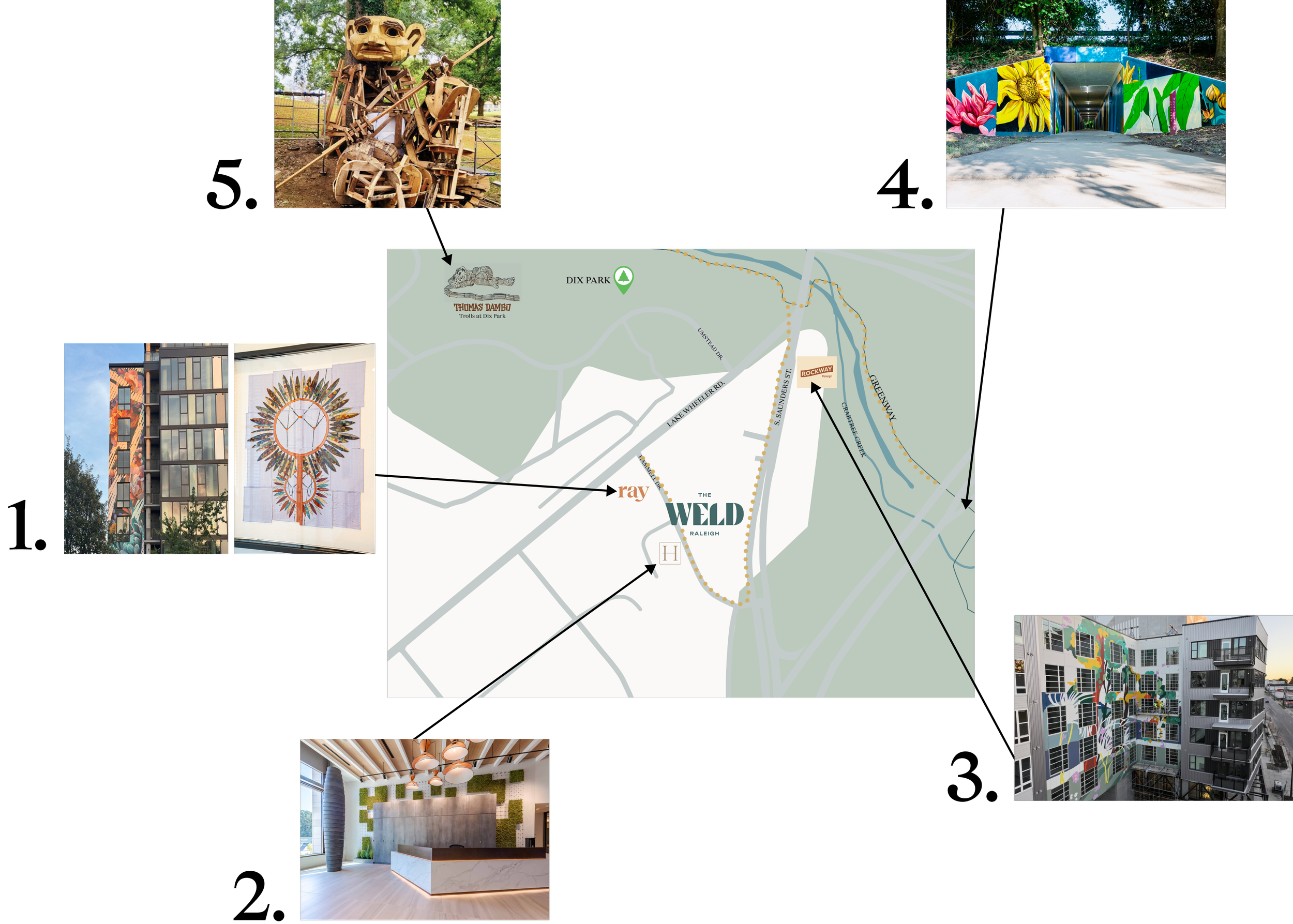 You're invited to explore the Parks District Art Walk, a vibrant, self-guided route showcasing five public art installations around The Weld. The full walk is roughly 2 miles, making it an easy, scenic loop through murals, sculptures, and the greenway near downtown Raleigh.
