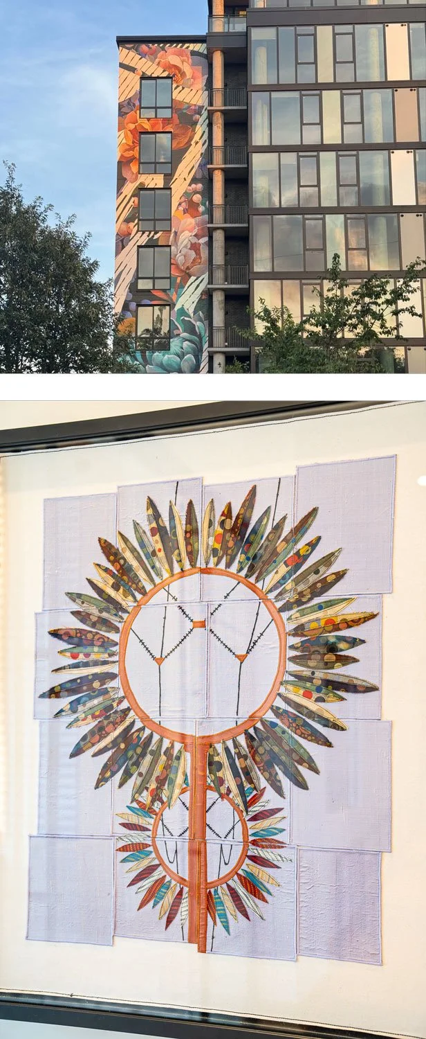 Inside the lobby of the Ray, you’ll find “Sunflower of Power” by Caitlin Cary, a Raleigh, NC–based textile artist and musician known for innovative, intricate sewn fabric collages she calls Needleprints. Cary crafts each piece exclusively from repurposed fabrics, primarily cast-offs from the upholstery and interior design industry.